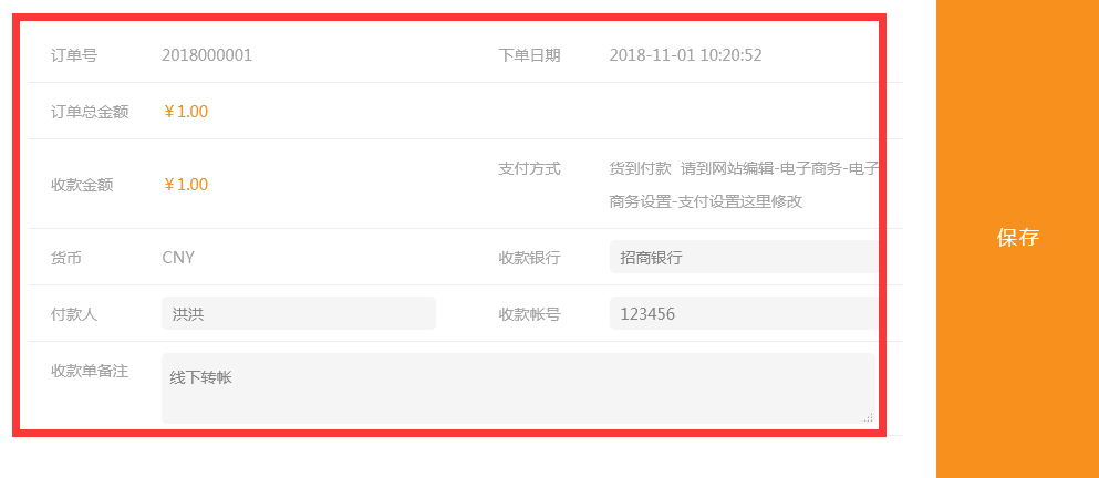 当订单状态是未支付时(客户无法使用网站提供的在线支付接口付款时,通过线下转帐、现金支付等方式收到的款)管理员在订单中点击支付后录入收款信息会生成收款单