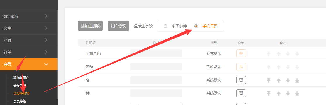 要使用短信找回、会员主字段需要设置为 手机